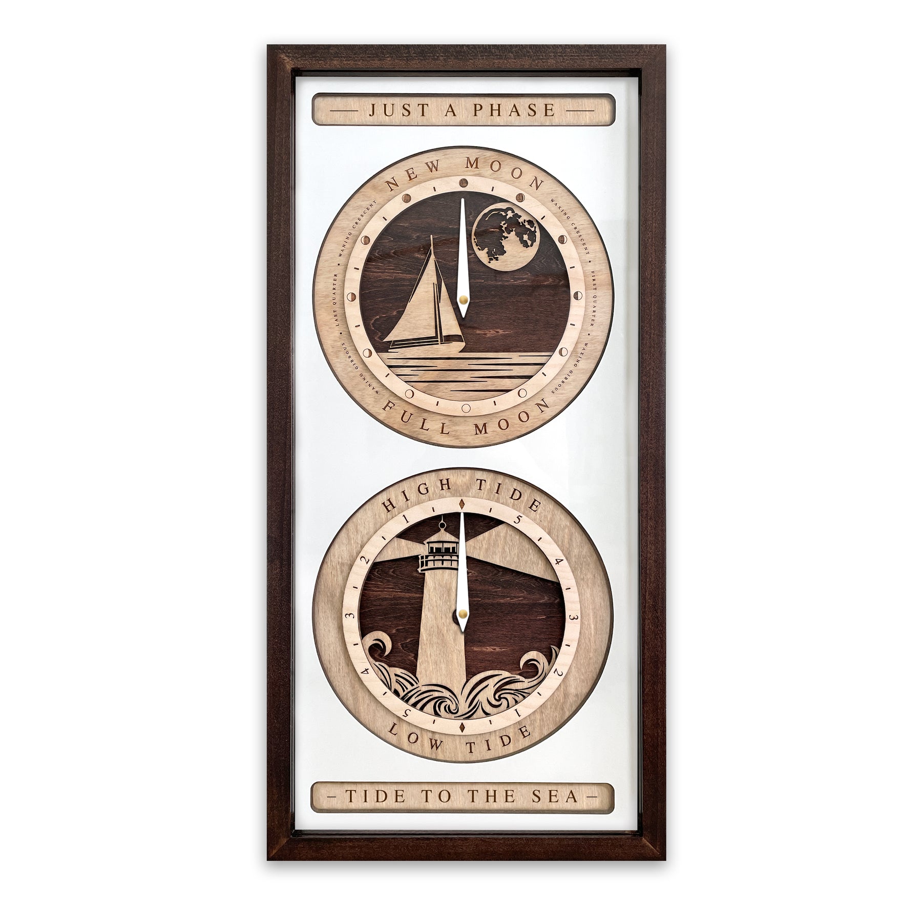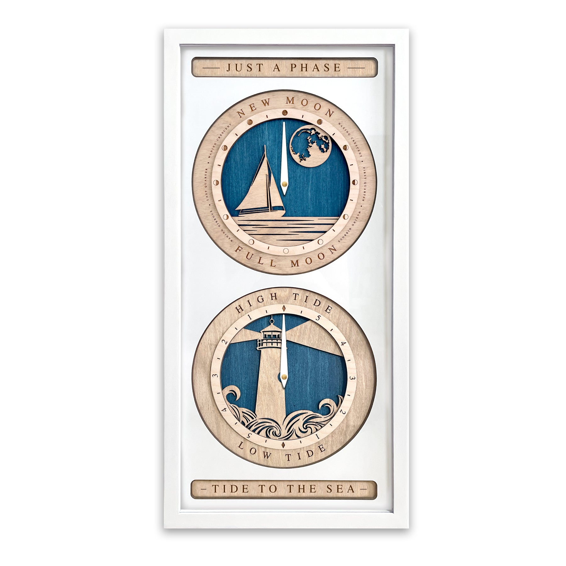Crafted of layered laser cut wood, this clock features our popular Sloop Sail Boat and Lighthouse designs. It is powered by two AA batteries (included) for effortless convenience. Whether you're a water enthusiast or simply appreciate nature-inspired decor, this timeless piece is a great way to track lunar and tide cycles. The tide clock can be configured to any harbor with a semidiurnal tide cycle.
